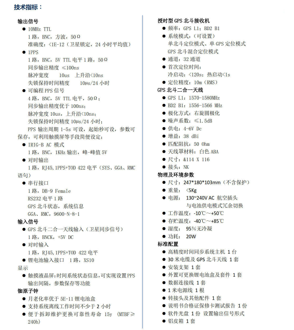 • HJ5435-BDV1 便攜式G選用高精度銣原子鐘和高精度授時型GPS北斗接收機,采用獨特的頻率測控技術,對銣鐘的輸出頻率進行精密測量與校準,使GPS馴服銣鐘的輸出頻率精確同步在GPS或北斗系統上,準確度優于1E-12,不用進行校準就能提供高精度的頻率信號。HJ5435-BDV1 同步裝置不但提供了高精度的頻率標準,還同時提供了“復現”的UTC時間基準。GPS或北斗馴服銣鐘輸出的10MHz信號經過...