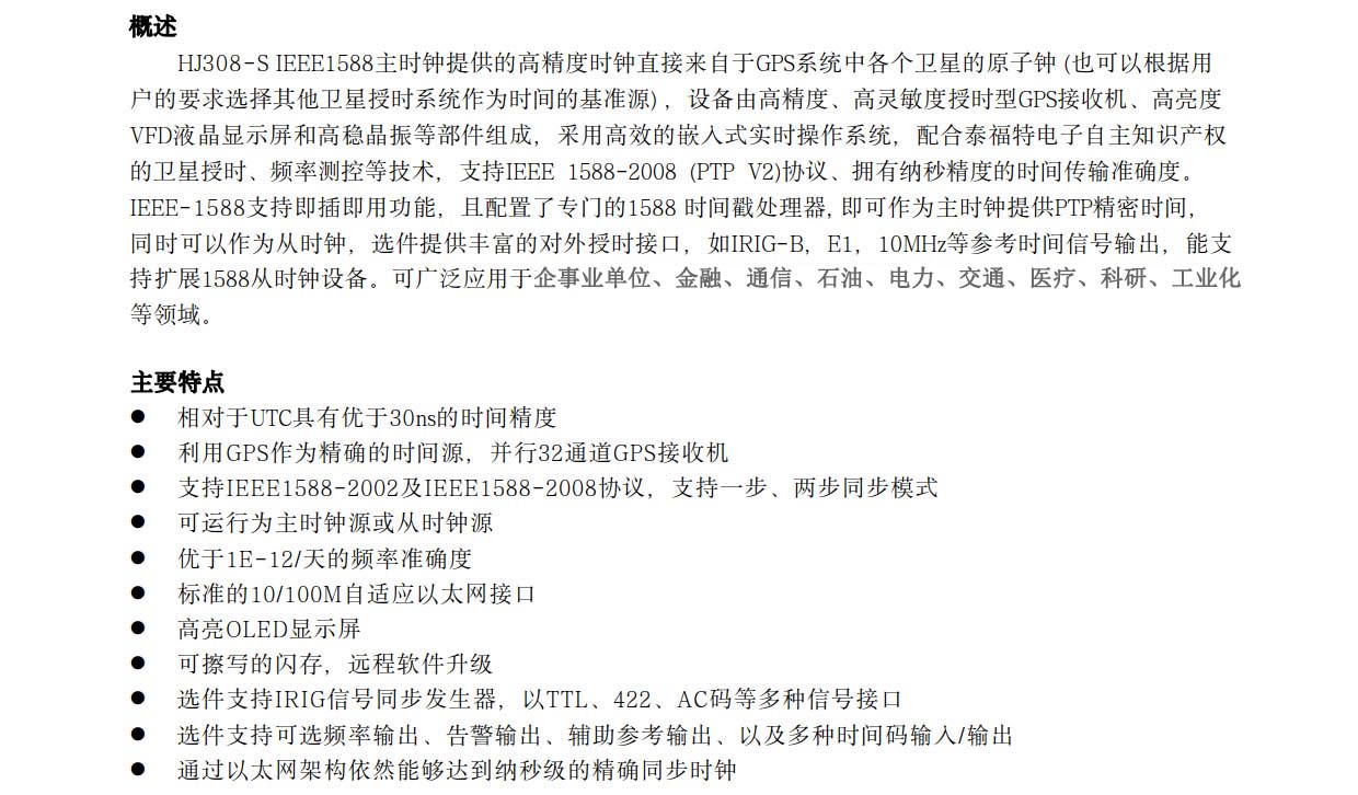 • HJ308-S IEEE1588主時鐘提供的高精度時鐘直接來自于GPS系統中各個衛星的原子鐘(也可以根據用戶的要求選擇其他衛星授時系統作為時間的基準源),設備由高精度高、靈敏度授時型GPS接收機、高亮度VFD液晶顯示屏和高穩晶振等部件組成,采用高效...