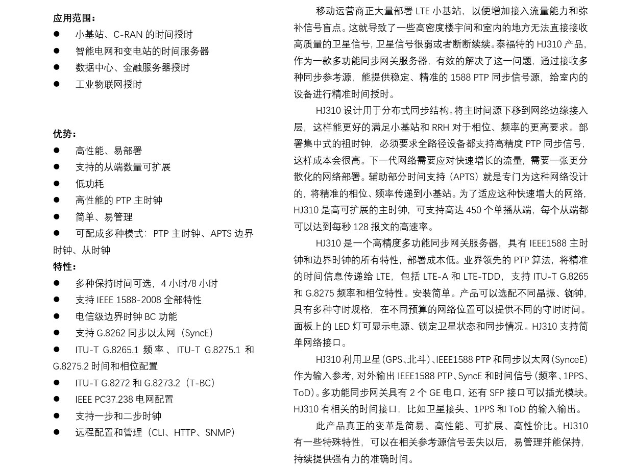 HJ310設(shè)計用于分布式同步結(jié)構(gòu)。將主時間源下移到網(wǎng)絡(luò)邊緣接入層,這樣能更好的滿足小基站和RRH對于相位、頻率的更高要求。部署集中式的祖時鐘,必須要求全路徑設(shè)備都支持高精度PTP同步信號,這樣成本會很高。下一代網(wǎng)絡(luò)需要應(yīng)對快速增長的流量,需要一張更分散化的網(wǎng)絡(luò)部署。...